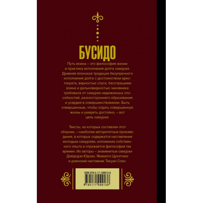 Бусидо – Путь воина – это философия жизни и практика исполнения долга самурая. Древняя японская традиция безупречного исполнения долга с достоинством аристократа, верностью слуги, бесстрашием воина и дальновидностью чиновника требовала от самурая недюжинных способностей, разностороннего образования и усердия в совершенствовании. Быть совершенным, чтобы отдать совершенную жизнь и умереть достойно – вот цель самурая.Тексты, из которых составлен этот сборник – наиболее авторитетные произведения, в которых содержатся наставления молодым самураям, изложение собственного опыта и отражается философия тех времен. Их авторы – знаменитые самураи Дайдодзи Юдзан, Ямамото Цунэтомо и дзэнский наставник Такуан Сохо.